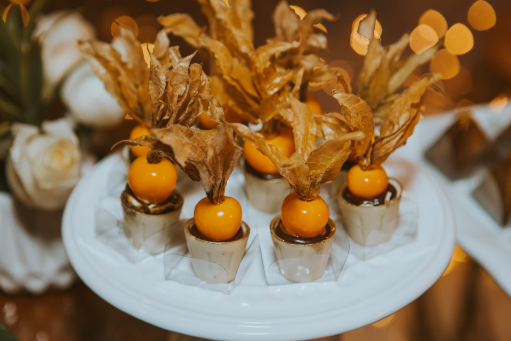 Outros destaques são o estiloso doce de physalis e a elegante tartelete de limão. Além do sabor marcante e da sofisticação, essas opções com frutas contribuem para um colorido diferenciado à mesa de doces. A tartelete de frutas vermelhas também se destaca como uma escolha refinada.