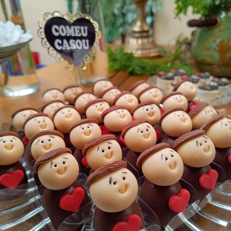 Um dos diferenciais especiais da Valdinéia Ribeiro Confeitaria — uma verdadeira atração em casamentos — são as trufas temáticas de Santo Antônio, conhecidas como o “doce casamenteiro”.