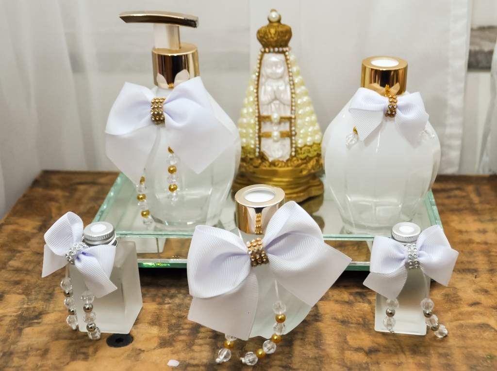 O ateliê também promove a personalização e aromatização de toaletes, com produtos como saboneteiras de sabonetes líquidos personalizadas, vidros de álcool em gel, aromatizadores de varetas, bandejas espelhadas para kit de vidros, além de kits de toaletes masculino e feminino com medicamentos e acessórios.
