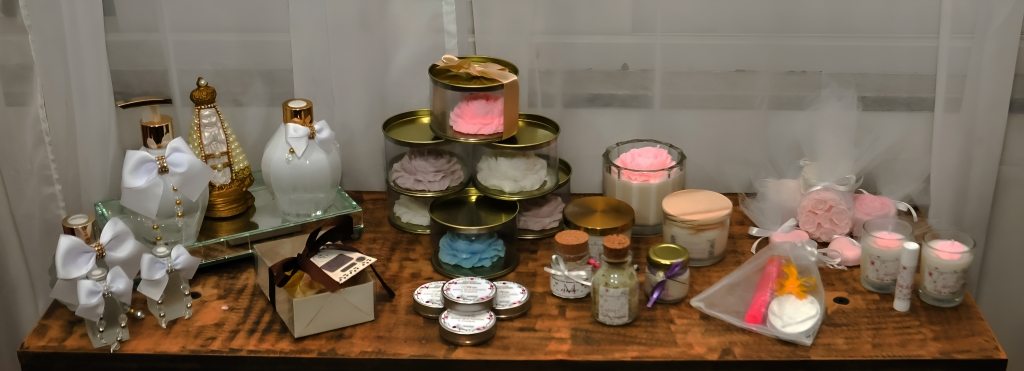 Um destaque no portfólio são as velas aromáticas, disponíveis em diferentes cores e tamanhos, incluindo opções mini, apresentadas em potinhos, tubolatas ou frascos de vidros reutilizáveis. As velas em formato de flor estão entre as alternativas mais encantadoras.