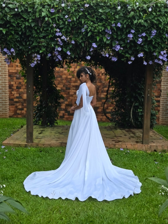 Por se tratar de um trabalho sob medida, o processo é totalmente flexível. A noiva pode solicitar alterações ao longo da produção, adaptando o modelo conforme suas preferências, sem que o projeto seja engessado.