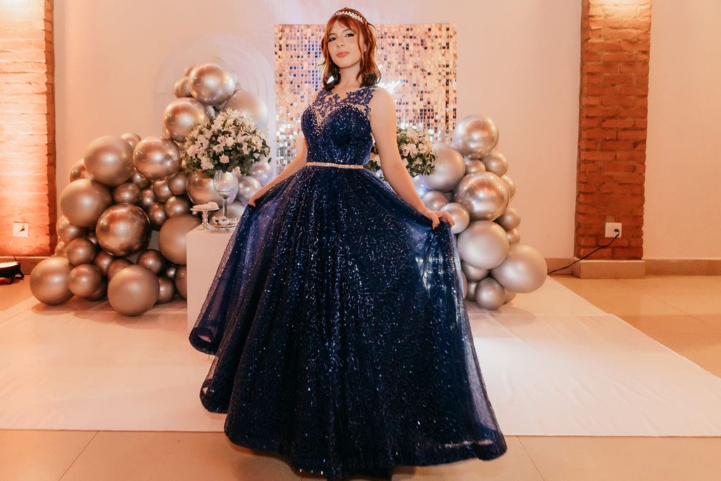 Para debutantes, há uma ampla variedade de cores e modelos, incluindo vestidos longos, curtos e macaquinhos. Entre os destaques estão os modelos dois em um, que combinam saia longa sobreposta a vestidos curtos ou macaquinhos, permitindo versatilidade ao longo da festa.