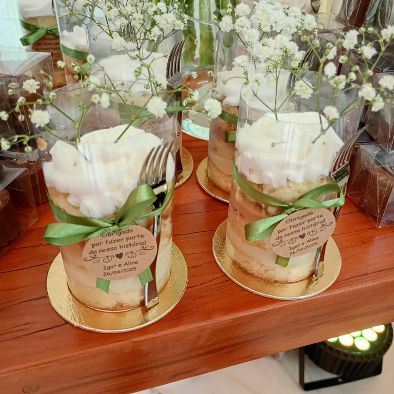 Apresentados no acetato, os minibolos são decorados com flores, tags personalizadas e acompanham um delicado garfinho, unindo elegância e praticidade. Além de saborosos, funcionam como uma solução inteligente: atuam ao mesmo tempo como lembrancinha e sobremesa, podendo substituir o tradicional bolo de corte e gerar economia para os clientes.