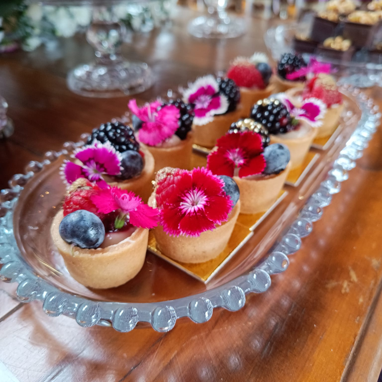 Outros destaques são o estiloso doce de physalis e a elegante tartelete de limão. Além do sabor marcante e da sofisticação, essas opções com frutas contribuem para um colorido diferenciado à mesa de doces. A tartelete de frutas vermelhas também se destaca como uma escolha refinada.